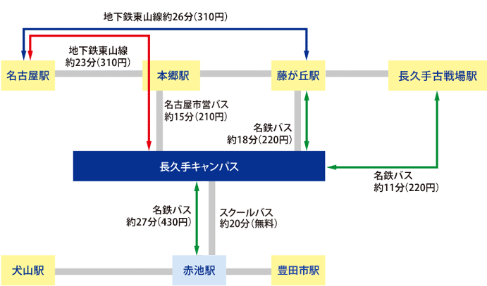 長久手キャンパスや星が丘キャンパスへの交通アクセスについてご紹介します。